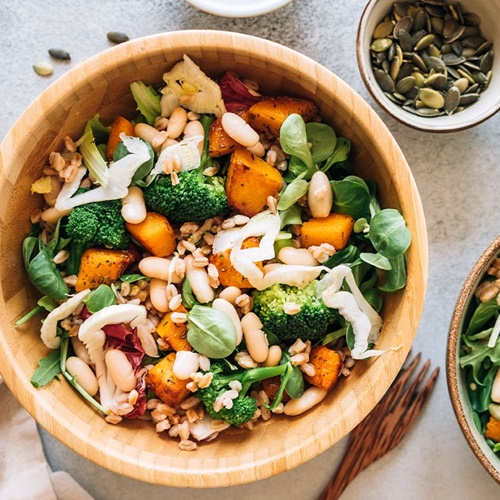 - Salad rau quả trộn, giàu năng lượng, có chứa bắp cải tím, cà chua sống, rau cần tây, rau xà lách,...
